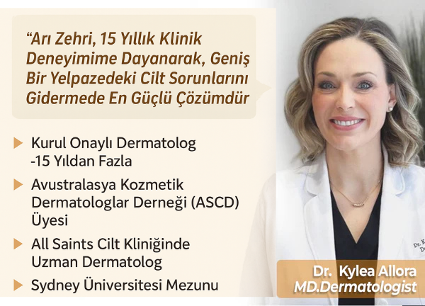 "Bir dermatolog olarak, cilt problemleri için etkili ve doğal çözümler bulmaya her zaman tutkuluydum. Laboratuvar ekibimle yaptığım kapsamlı araştırmalar ve 2000’den fazla katılımcıyla yapılan klinik denemelerden sonra, arı zehrinin geniş bir cilt sorununu çözmek için güçlü bir doğal içerik olduğunu keşfettim. Bu da beni, Arı Zehri Tüm Bir Arada Kremi’ni oluşturmaya yönlendirdi—doğal ve etkili bir şekilde çoklu cilt sorunlarını gidermek için tasarlanmış hepsi bir arada çözüm." - Dr. Kylea Allora, MD. Dermatolog