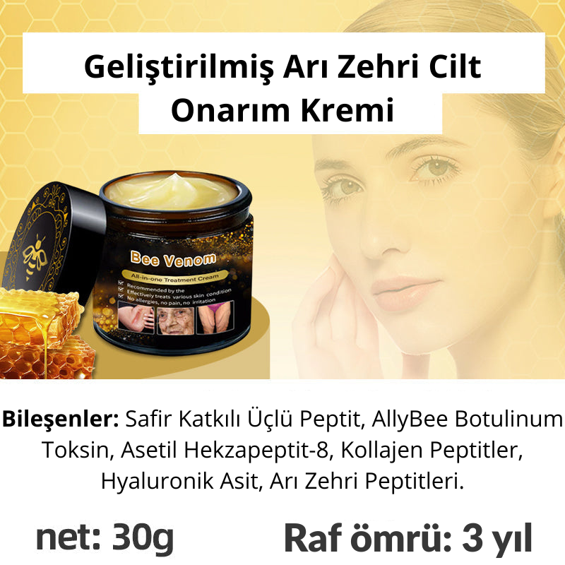 Arı zehri, melittin, apamin ve adolapin gibi biyoaktif bileşenler açısından zengindir. Bu bileşenlerin iltihap yollarını engelleyerek iltihabı azalttığı ve etkilenen bölgelerde kan dolaşımını artırarak cilt onarımı için gerekli besinleri sağladığı bilimsel olarak kanıtlanmıştır. Bu kremi düzenli kullanmak egzama, sedef hastalığı ve rozasea gibi kronik cilt rahatsızlıklarını etkili bir şekilde yatıştırabilir ve daha pürüzsüz, daha sağlıklı bir cilt elde etmenizi sağlar.