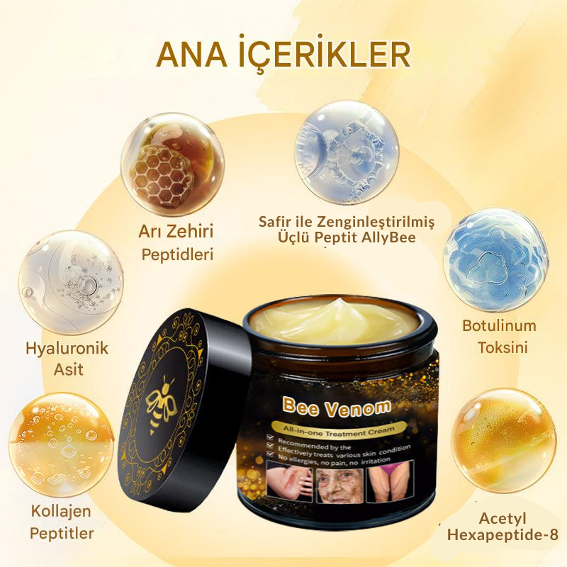 Arı Zehri Tüm Bir Arada Kremi, benzersiz biyoaktif bileşen karışımı sayesinde çeşitli cilt sorunlarını hedefleyen güçlü bir çözümdür. Kanıtlanmış anti-enflamatuar, antibakteriyel özellikler ve güçlü enzimler ile farklı cilt problemlerini etkili bir şekilde ortadan kaldırır.